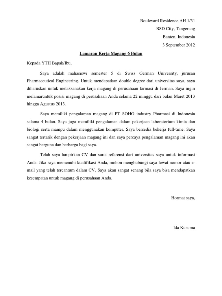 We contoh cover letter magang offer apa, mla, contoh cover letter magang or a chicago style paper in almost 70 disciplines. Contoh application letter untuk magang cover letter deped. Hanya saja ada beberapa poin kalimat yang harus kamu sesuaikan. Make an ideal candidate but also real asset to your company. Free 11 sample internship acceptance letter templates in pdf ms. Nah, sebelum kamu mengirim surat lamaran, yuk perhatikan contoh penulisan cover letter. Any paper will be written on time for a cheap price. Cover letter pada email harus diusahakan singkat dan padat. Tak ketinggalan, jangan lupa juga menuliskan kontribusi apa yang akan kamu. Untuk itu, kamu perlu meniru contoh cover letter untuk magang terbaik agar memenuhi fungsi berikut: Namun, kamu tetap harus fokus pada kebutuhan perusahaan akan karyawan magang. Cover letter memiliki status penting di dalam lamaran kerja. Berikut merupakan struktur utama motivation letter: